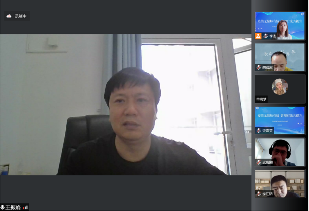 最后,王振峰副院长充分肯定了6位班主任的经验分享及线上教育教学以来班主任们的努力付出。并对我院学管队伍提出了三点期盼,一要热爱和享受班主任工作;二要勤于思考,善于总结;三要学会沟通和协调。同时对学生管理部门提出明确要求,一要抓好培训,注重时效,尽量减压减负;二要争取政策,惠及学生;三要以建设名班主任工作室为契机,为班主任搭建平台,提高专业化水平,走出学院,成为德育名师;四要为班主任当好后盾,做好服务。