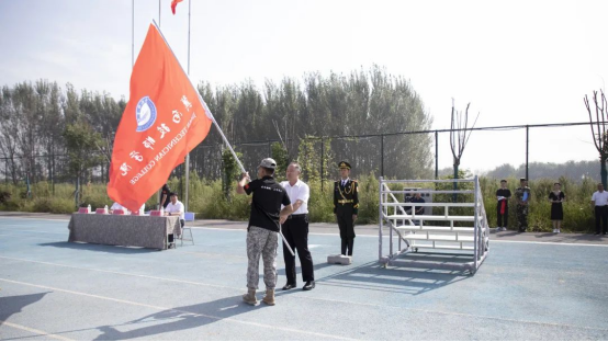 院长王小生为军训拓展训练总教官韩群授冀南技师学院校旗。