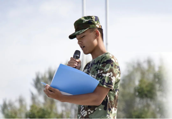 新生代表2022技师网络三班阎勃发言,表示将在训练中积极配合教官,听从指挥,以军人般钢铁意志、用积极乐观心态面对未来的学习生活!