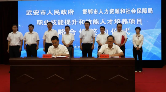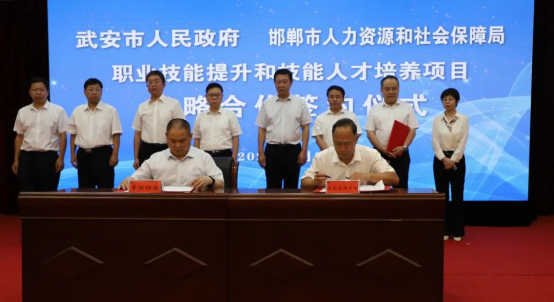 9月9日上午,邯郸市人力资源和社会保障局、冀南技师学院与武安市人民政府职业技能提升和技能人才培养项目战略合作签约仪式在武安宾馆举行。武安市委书记刘浩峰主持签约仪式,邯郸市人力资源和社会保障局党组成员、副局长胡晓斌,学院党委书记许克亮,党委副书记、院长王小生,副院长刘芳,武安市领导陈虎清、李卫峰、郭全生,出席签约仪式。