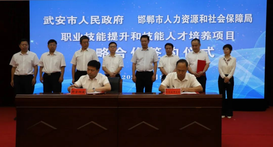 刘浩峰代表武安市委、市政府对莅临签署仪式现场的各位领导表示热烈的欢迎,对邯郸市人社局对武安工作长期以来的支持和帮助表示由衷的感谢,对《职业技能提升和技能人才培养项目战略合作协议》和《校企合作协议》的成功签署表示热烈的祝贺。刘浩峰表示,此次签署仪式,必将成为推动武安市技能人才队伍建设实现高质量发展的全新契机,武安技能强市、人才强市必将进入提质培优、增值赋能的全新阶段。