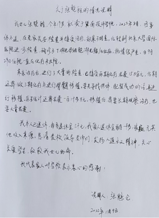 近日,一场特殊的爱心募捐在冀南技师学院师生中紧锣密鼓进行着......我院公共服务与教育系2021级幼高一班张晓雅同学品学兼优,积极乐观,乐于助人,曾代表学院参加北京冬奥会志愿活动。不料“天有不测风云”,这样一位花样少女因身体不适,于2022年9月到北京大学国际医院肿瘤科检查,确诊为T淋巴母细胞淋巴瘤(白血病)。现在已进行两期化疗,后期还需做三次化疗,并进行骨髓移植,预计治疗费用高达120万元左右,移植成功后还需大量治疗费用。因父母均已退休,无其他经济来源,这让本不富裕的家庭雪上加霜,苦不堪言。
