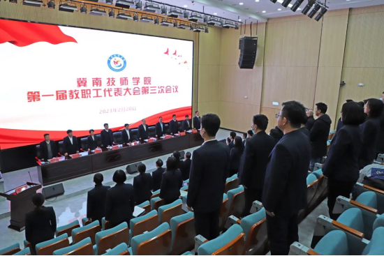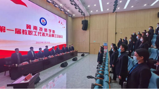 最后,雄浑激昂的《国际歌》响起,冀南技师学院第一届教职工代表大会第三次会议在民主、团结、和谐、奋进的气氛中胜利闭幕。