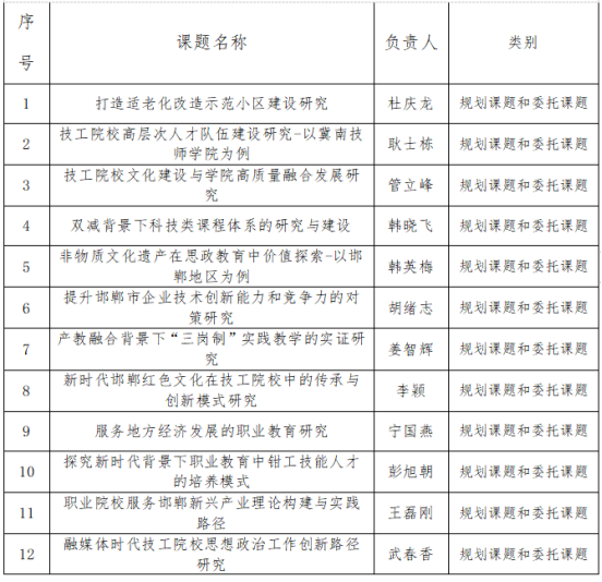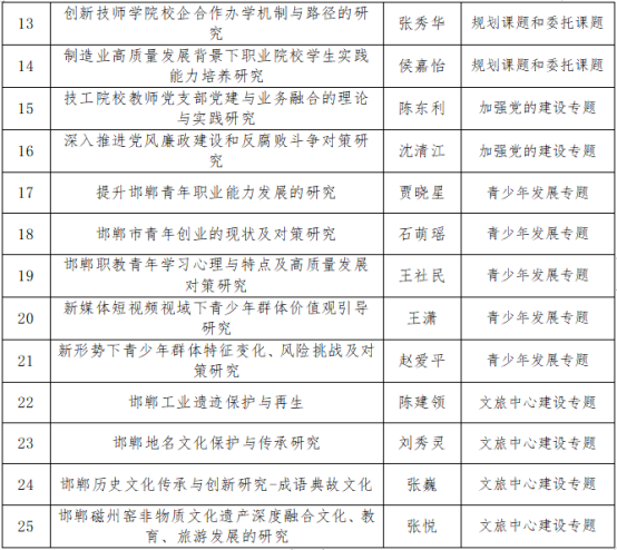根据《邯郸市2023年度哲学社会科学规划重点课题立项项目》通知,我院25项课题获邯郸市2023年度哲学社会科学规划课题立项!其中规划课题和委托课题14项,加强党的建设专题课题2项,青少年发展专题课题5项,文旅中心建设专题课题4项。