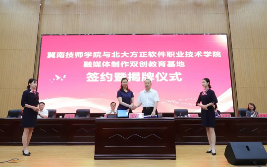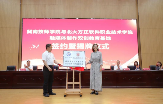 党委书记许克亮与北京北大方正软件职业技术学院潘秀峰校长共同为融媒体制作人才培养产学研用双创教育基地揭牌。