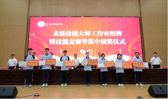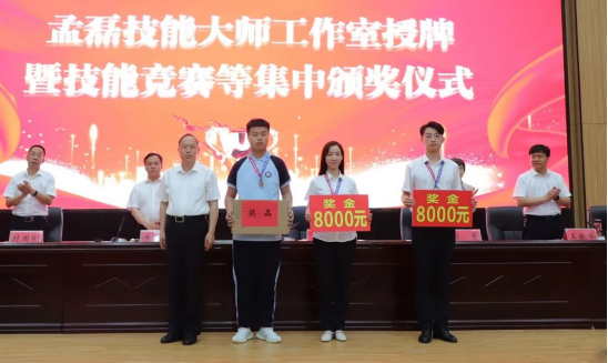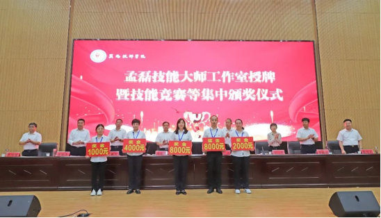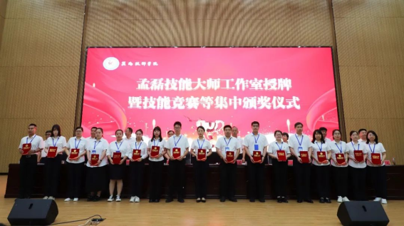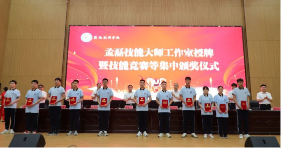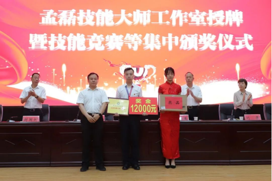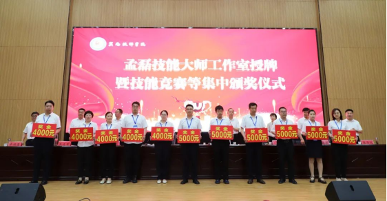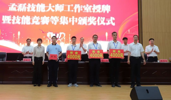党委书记许克亮为河北省第一届技能大赛荣获金牌的教师孟磊颁奖,同时为“孟磊技师大师工作室”授牌。