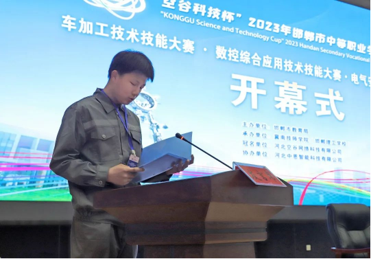 邯郸市教育局高职处处长佘在勇指出,此次大赛是贯彻落实党的二十大精神,以赛育才、以赛引才的务实举措,希望各位参赛选手充分发挥聪明才智,以良好的心理素质和精神风貌,赛出风格,赛出水平,取得好成绩。同时也希望工作人员和裁判员遵守竞赛规则,坚持公平、公正、公开的原则,确保竞赛顺利进行。随后,佘处长宣布2023年邯郸市中等职业学校学生车加工技术、电气安装与维修、数控综合应用技术大赛开幕。
