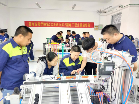学院与河北格力钛新能源有限公司、河北新金钢铁有限公司、中国人民解放军第四七二三工厂、冀南钢铁有限公司、邯郸市丛安供电服务有限公司大名县分公司等企业联合开展电工(初级、中级、高级)、钳工(初级、中级)、工业机器人系统操作员(中级)等培训班,结合企业生产和岗位实际有针对性的制定教学计划,通过线上理论学习和线下实操训练,有效提升学员的专业知识和技能水平,强化学员安全意识、质量意识和法律意识,大力弘扬劳模精神、培育工匠精神,让每一名学员充分发挥自身潜力,尽其所能、尽展其才,不断增强科研和科技创新能力,为企业经济发展做出更大贡献。