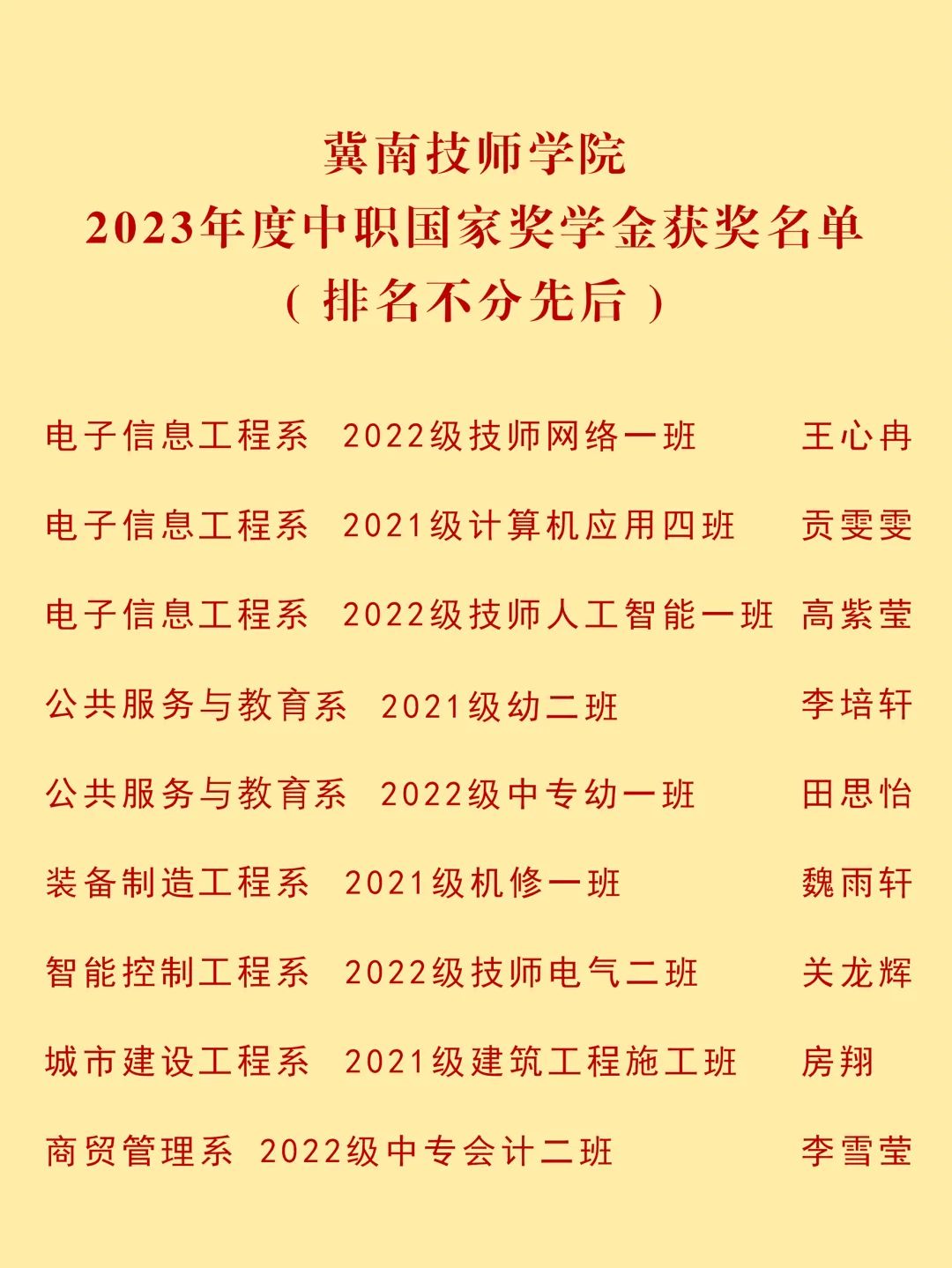 近日,我院9名同学荣获2023年度中职国家奖学金,1名学生荣获“技能雏鹰”助学金,他们以榜样的力量激励广大学子砥砺奋进。