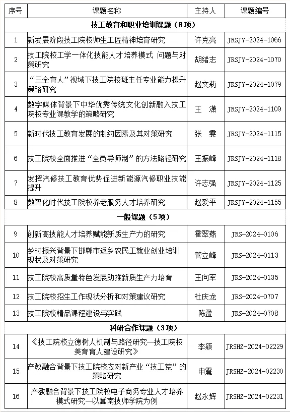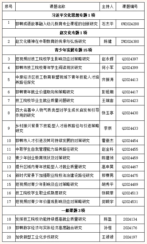近日,邯郸市2024年度职业教育教学改革立项课题6项获批,祝贺他们!