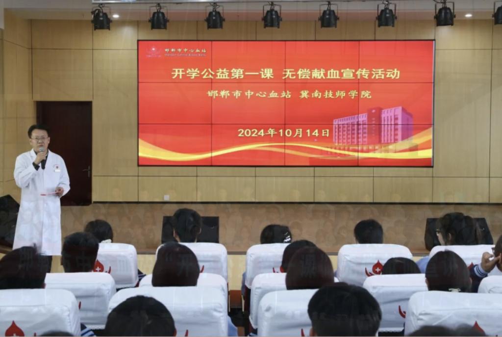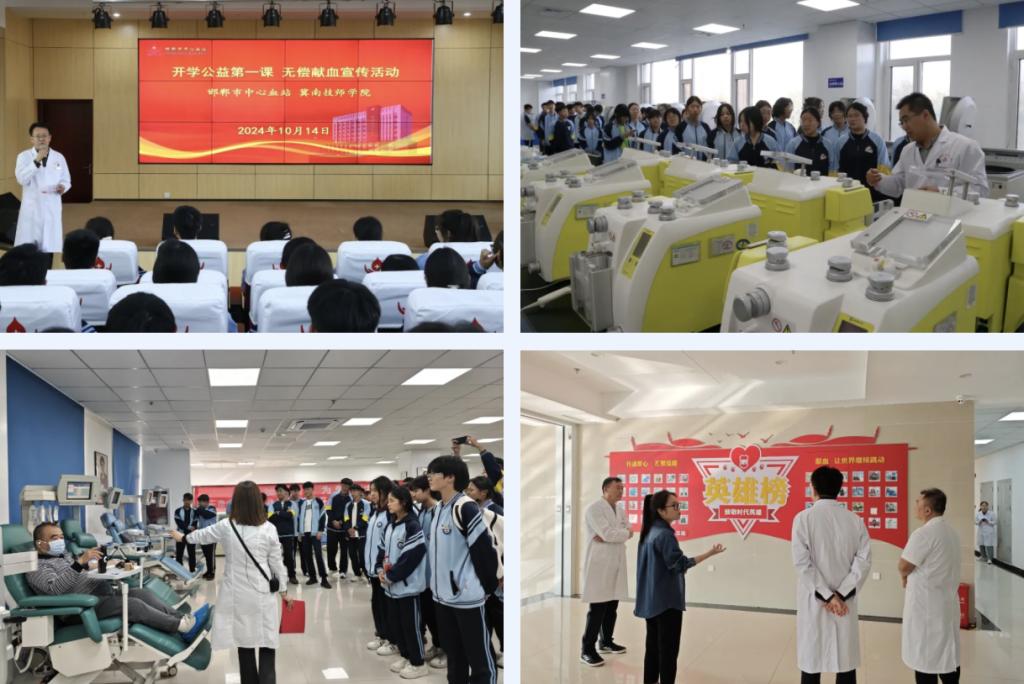 10月14日下午,学生工作科(团委)苏琳琳老师带领各系部优秀学生干部、学生代表共100余人走进邯郸市中心血站,参观献血科普馆,探索“血液的奥秘”。邯郸市中心血站副书记、副站长琚晓虎、献血服务科负责人李丽、献血办负责人张则昌就血液生理知识和无偿献血注意事项、无偿献血权益和志愿服务等方面为学生们组织了专业知识讲座。通过本次无偿献血主题宣教活动,学生们对无偿献血法律法规、血液知识和无偿献血知识有了更深刻的认识,激发了参与公益活动的热情,深切感受到无偿献血救助他人、奉献社会的重要意义。