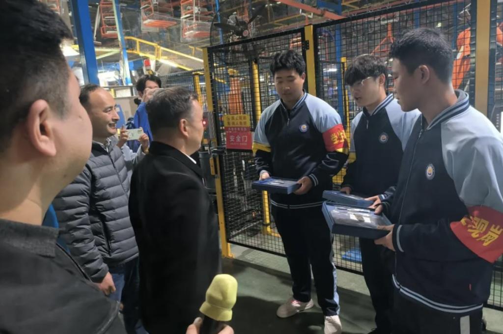 随后,一行人前往车间看望在企业参与“观岗”的学生们。许书记向学生们发放学习用品,勉励学生们一定要利用好岗位实践学习的契机,多向岗位上的师傅学习,多听、多看、多问、多练,早日成长为企业的技术骨干、能工巧匠。
