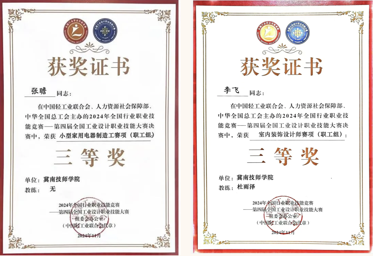 2024年11月27日至30日,由人力资源和社会保障部、中华全国总工会、中国轻工业联合会共同主办的2024年全国行业职业技能竞赛—第四届全国工业设计职业技能大赛决赛在河南郑州成功举办,来自全国24个省、市、自治区的600余名选手会师决赛、同台竞技。我院装备制造工程系教师张瞻获得小型家用电器制造工赛项职工组三等奖,公共服务与教育系教师李飞获得室内装饰设计师赛项职工组三等奖的优异成绩。