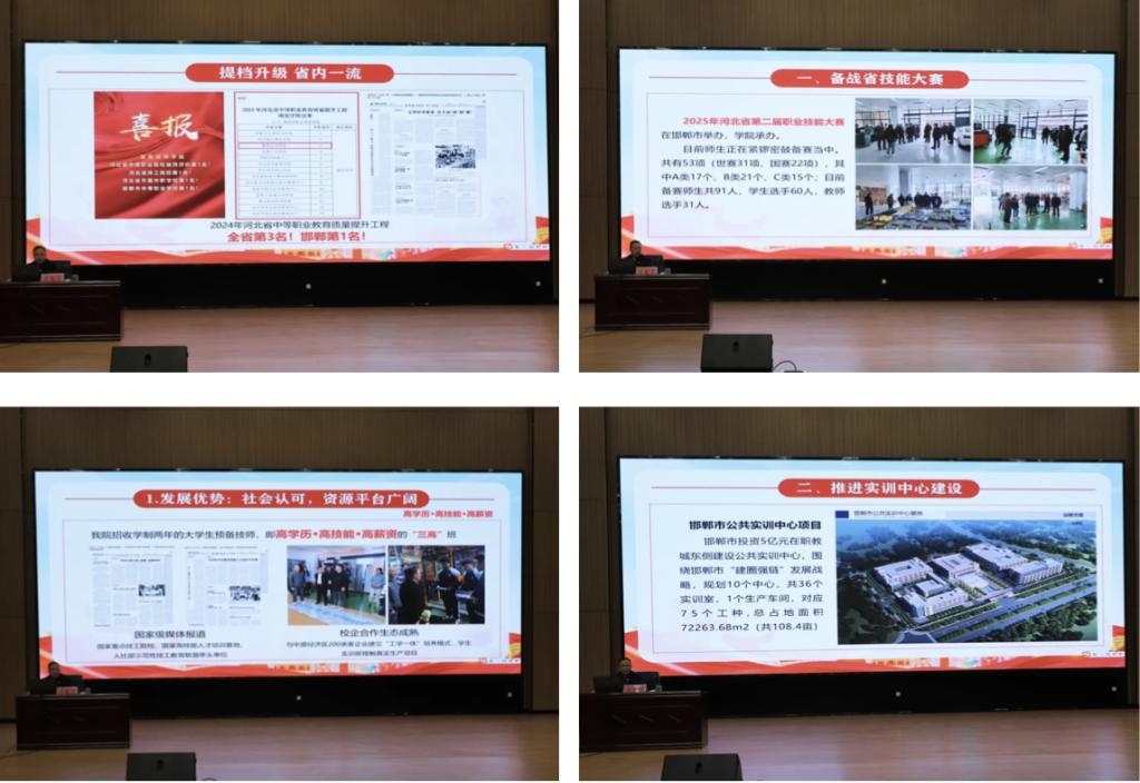 许书记以“技能成才启新篇 踔厉奋发向未来”为主题展开讲解,向学生们传达了技工教育未来发展方向,技工院校毕业生待遇政策,着重介绍了四年来学院在师资力量、实训建设、技能大赛、中职教育质量提升评价上取得的办学成绩,随后向大家公布了今年备战省技能大赛、推进实训中心建设、推进技师“三高”班建设、平安校园建设四大措施。强调新学期伊始,学生们要严格要求自己,规范自身行为,以承办大赛为契机,展现冀师学子精神风貌,向全省展示学院良好形象。