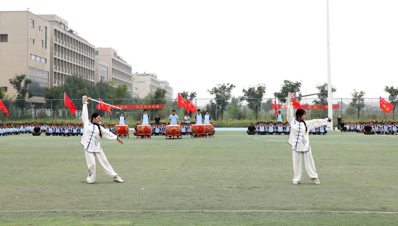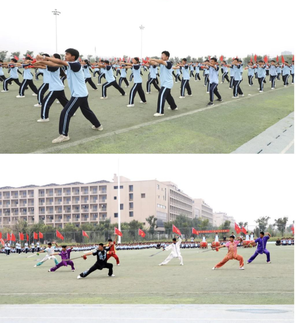 刀旗手、拳术表演、九节鞭、单刀表演、双人剑、少林连环拳,一场场武术表演次第登场,将力与美的交融演绎得淋漓尽致。精准的招式、铿锵的发力,既是训练成果的生动印证,更是 “请党放心、强国有我” 的青春誓言,在晨光与剑光交织中,掷地有声。