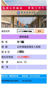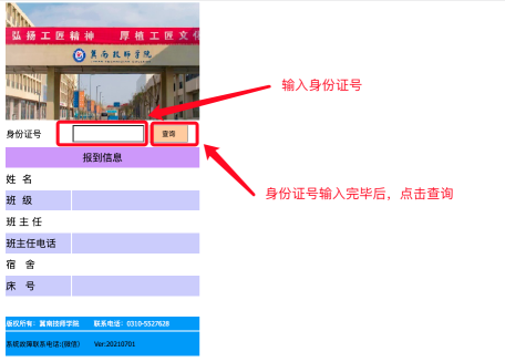 一、我院开通了班级信息线上查询功能,可通过下方链接,输入学生身份证号查询自己所在班级、宿舍、班主任及联系方式等信息(附具体操作流程图)。