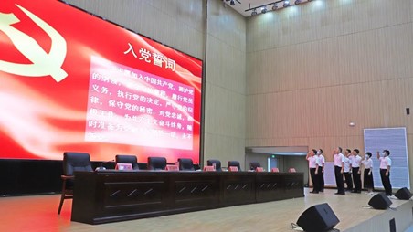 面对鲜红的党旗,党委书记许克亮带领与会党员重温入党誓词,铿锵有力的宣誓声响彻大厅。