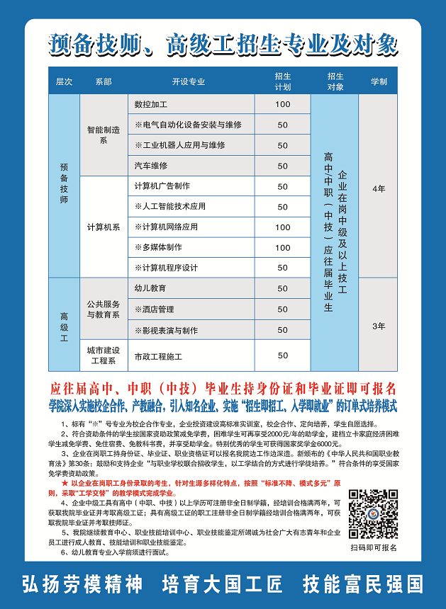 冀南技师学院2022年招生简章——高中、中职(中技)毕业生,企业在岗中级及以上技工专用