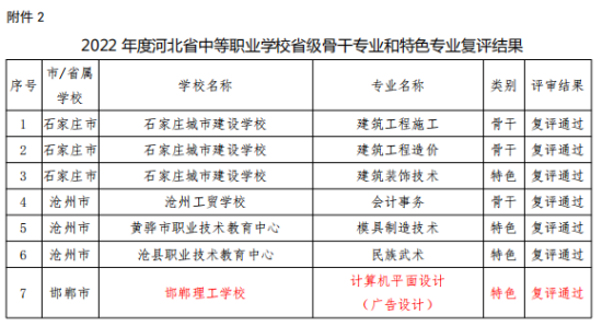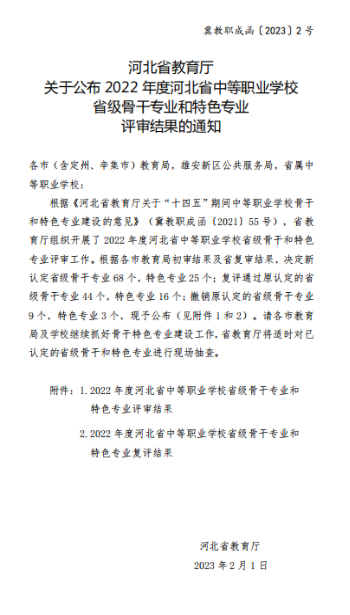 2023年2月1日,河北省教育厅公布2022年度河北省中等职业学校省级骨干专业和特色专业评审结果,我院计算机平面设计专业顺利通过!