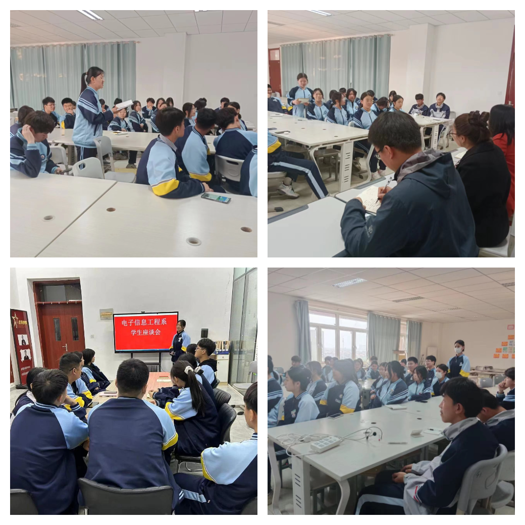为加强与学生们的沟通交流,深入了解学生在学校的学习和生活状况,积极发现并解决教学中存在的各类问题,推进我院的教风、学风及班风建设,促进整体教学质量不断提高,电子信息工程系于4月10日下午,召开学生座谈会,系部教学负责人、教学干事、教研组长和各专业学生代表参加。