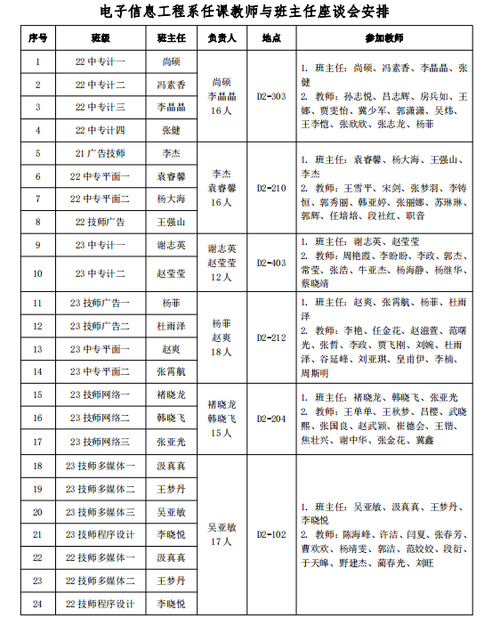 教师间的默契配合,如同乐曲中的和谐和弦,对提升班级整体素质起着至关重要的作用。为加强班级管理,促进班风、学风、教风建设,更深层次了解学生心理动态和知识掌握情况,明确下阶段授课方向,统一思想形成合力,根据教学工作计划安排,4月12日下午 ,电子信息工程系召开了教师与班主任座谈会。全体任课教师和班主任齐聚一堂,共同探讨如何更好地推动班级管理工作,促进学生全面发展。