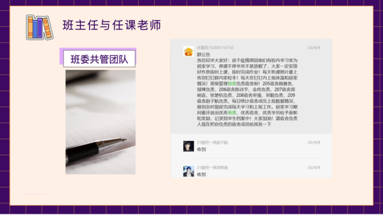 公共服务与教育系2020级幼教一班班主任武桢老师从主要工作措施、日常活动安排、活动效果3个方面作分享,干货满满,新颖实用。武桢老师将“班委责任制”、“积分透明化”、“家校联合”三个管理手段进行组合,全方位地提高了班级线上管理的效率。