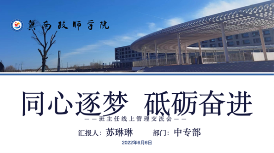 中专部2021级计三班班主任苏琳琳老师以《同心逐梦砥砺奋进》为题,从“班级管理网格化、定点管理追踪化、线上学习模式化、激励方式多样化、多方管理育人化”5个方面作分享,内容充实,方法科学,对年轻班主任的管理有良好的指导作用。