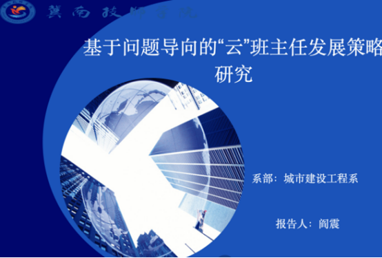 城市建设工程系2021级市政工程班班主任阎震老师以《基于问题导向的“云”班主任发展策略研究》为题,为班主任带来一场科研式的线上管理经验分享,向大家阐述了解决学生问题的方法。