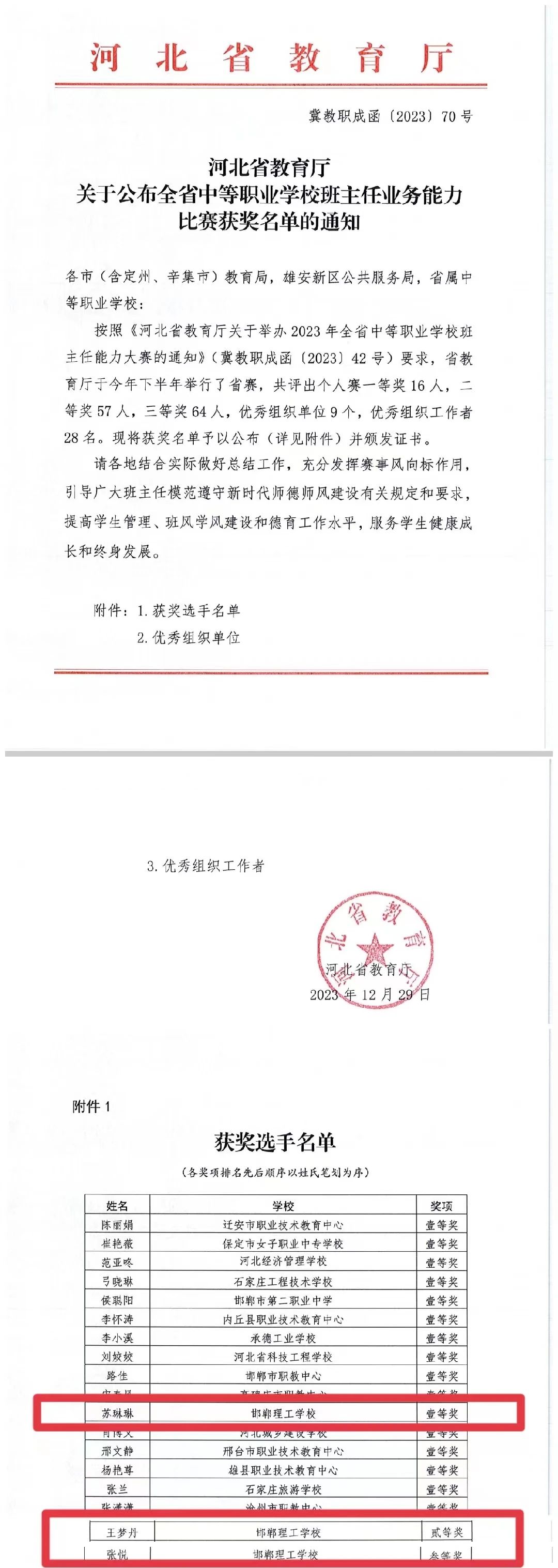 根据《河北省教育厅关于举办2023年全省中等职业学校班主任能力大赛的通知》(冀教职成函〔2023〕42号),河北各市各校遴选出255名选手参加了今年全省中职班主任业务能力大赛,我院3名教师参赛。