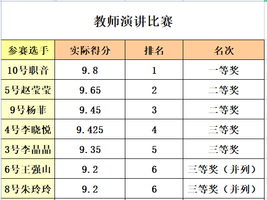 参赛教师举止端庄大方,精神饱满,富有激情。本次演讲比赛名次排名如下,共评出1个一等奖,2个二等奖,4个三等奖。
