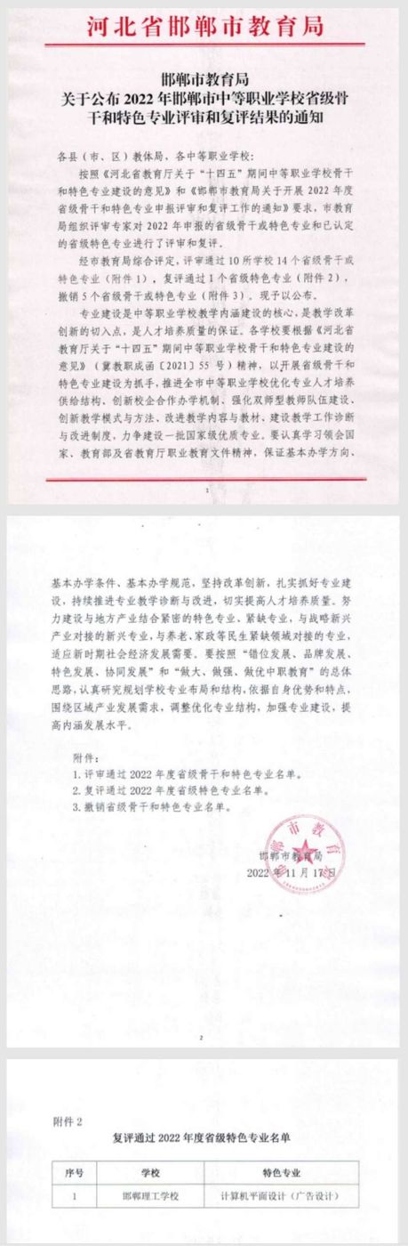 2022年11月18日,邯郸市教育局发布《关于公布2022年邯郸市中等职业学校省级骨干和特色专业评审和复评结果的通知》。冀南技师学院计算机平面设计(广告设计)专业通过“河北省特色专业”复评。