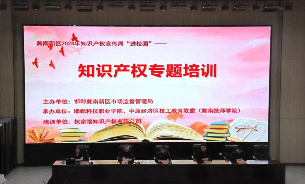 为了提升师生员工知识产权保护和运用意识,激发师生员工参加科研创新的积极性,在第24个世界知识产权日来临之际,4月18日下午3:00,在冀南技师学院国际学术交流中心一楼报告厅组织开展了“知识产权”专题培训。本次活动由邯郸冀南新区市场监督管理局主办,邯郸科技职业学院、中原经济区技工教育联盟(冀南技师学院)承办。现场参加培训的有邯郸科技职业学院教师代表、学生代表,冀南技师学院教师代表、学生代表。其他盟员单位通过学院公众号观看直播。