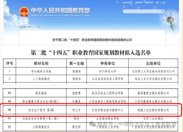 11月3日,在教育部公示的第二批“十四五”职业教育国家规划教材名单中,迁安职教中心郑立冬等主编的《安全生产常识(第3版)》教材成功入选,这一成绩不仅为学校的教学改革发展注入了强劲动力,更标志着我校教材建设工作取得了进一步突破。