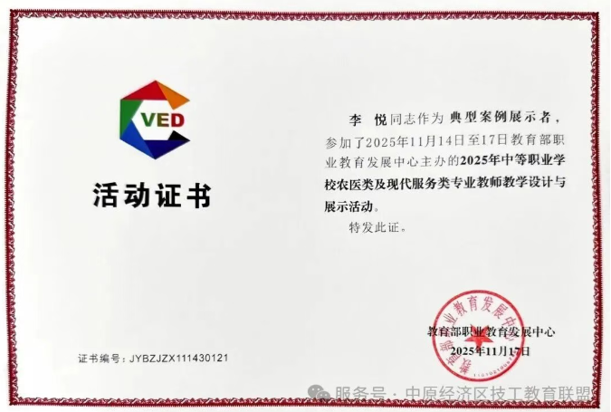 11月14日—17日,由教育部职业教育发展中心主办的全国中等职业学校教师教学设计与展示活动在湖南省株洲市举行。唐山劳动技师学院建筑工程系青年教师李悦历经市赛、省赛层层选拔,代表河北省参加了此次活动。凭借其出色的教学设计与扎实的课堂实践,在激烈的全国竞争中脱颖而出,以优异的表现获得活动最高奖项——“典型案例展示者”称号,展现了我院教师卓越的教学风采与深厚的专业素养。