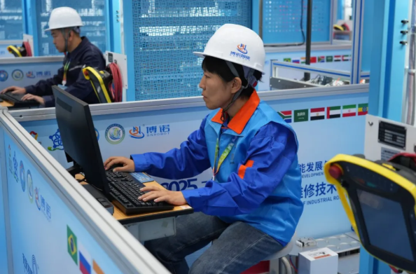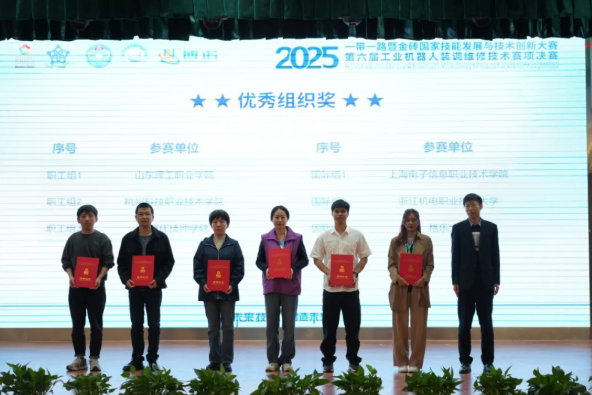 在上海举办的2025年第六届“一带一路暨金砖国家技能发展与技术创新大赛”工业机器人装调维修技术赛项决赛中,我院师生表现卓越,斩获多项荣誉,并成功晋级2026年摩洛哥北非国际赛,并将代表中国角逐国际赛场。