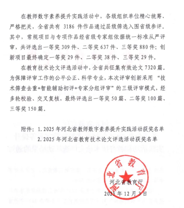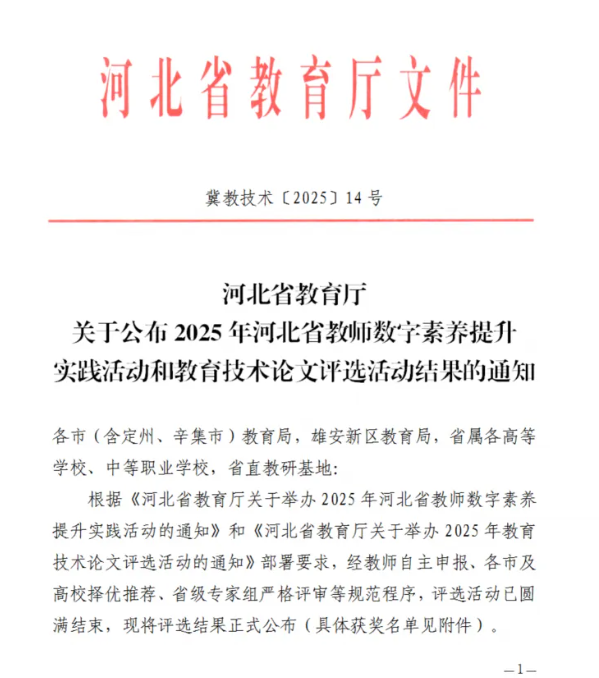 近日,在由河北省教育厅主办的“2025年河北省教师数字素养提升实践活动和教育技术论文评选活动”中,我校机械电气系的刘宏乐、邢利然两位教师凭借扎实的专业能力和创新实践精神,在职业教育实践性教学案例项目中荣获一等奖。