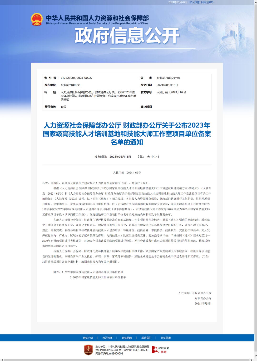 近日,人力资源社会和保障部办公厅、财政部办公厅联合发布了《关于公布2023年国家级高技能人才培训基地和技能大师工作室项目单位备案名单的通知》(人社厅函〔2024〕69号),确定我院为2023年国家级高技能人才培训基地项目单位,建设专业为电气安装与维修、工业机器人应用与维护、无人机应用技术3个专业。这是学院继2020年获批国家级高技能人才培训基地建设项目以来再次申报成功! 国家级高技能人才培训基地的主要任务是开展高...