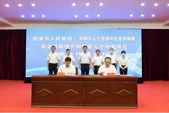 9月9日上午,邯郸市人力资源和社会保障局、冀南技师学院与武安市人民政府职业技能提升和技能人才培养项目战略合作签约仪式在武安宾馆举行。武安市委书记刘浩峰主持签约仪式,邯郸市人力资源和社会保障局党组成员、副局长胡晓斌,学院党委书记许克亮,党委副书记、院长王小生,副院长刘芳,武安市领导陈虎清、李卫峰、郭全生,出席签约仪式。 刘浩峰代表武安市委、市政府对莅临签署仪式现场的各位领导表示热烈的欢迎,对邯郸市人...