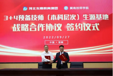 9月27日上午,我院与河北东南教育集团“3+4预备技师优质生源基地”战略合作签字仪式在河北东南教育集团旗下新落成的邯郸冀南信息工程学校圆满举行。学院党委书记许克亮、院长王小生、副院长刘芳、邯郸市教育局高职处处长佘在勇、东南教育集团执行总裁程贤龙出席签字仪式。 当日,正值邯郸冀南信息工程学校落成暨开学庆典仪式举行。程贤龙总裁代表集团公司致辞,向出席落成仪式暨开学庆典的各位领导、同仁表示诚挚的谢意。希望...